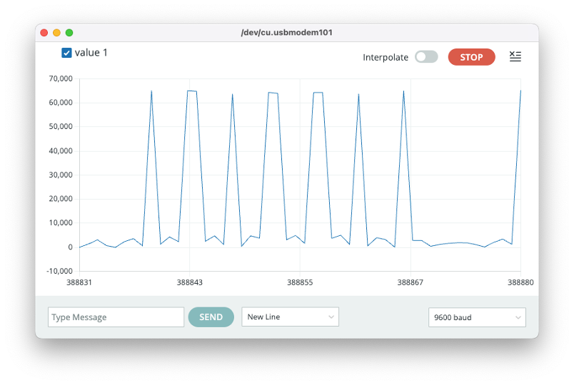 }Open the Serial Plotter, and you will see the loudness change curve of the sound.