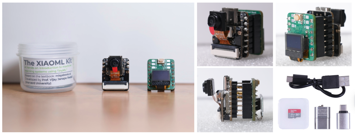 The XIAOML Kit bundles the XIAO ESP32S3 Sense with an expansion board, IMU, OLED display, and SD card toolkit: