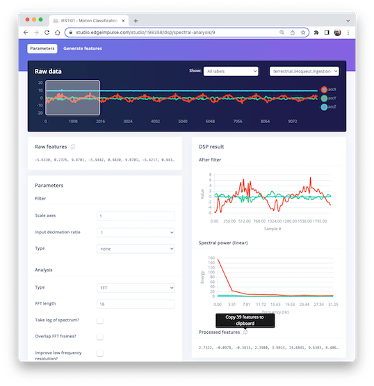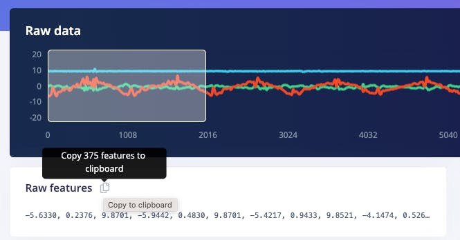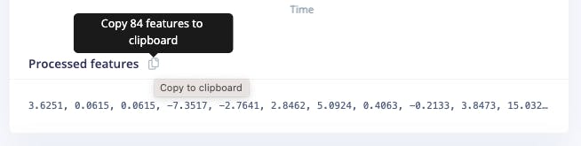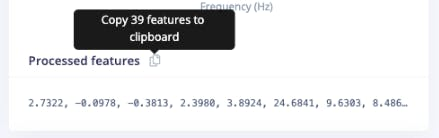 Selecting the Raw Features on the Studio Spectral Analysis tab, we can copy all 375 data points of a particular 2-second window to the clipboard.