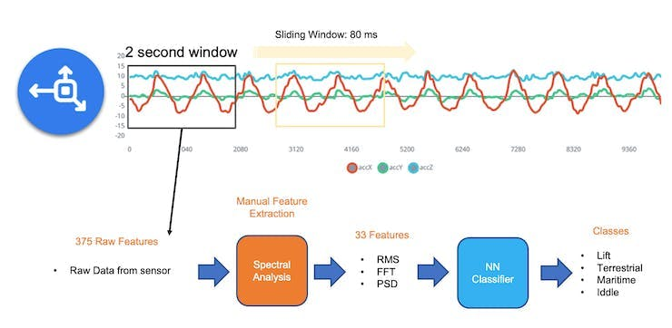 In the hands-on project, Motion Classification and Anomaly Detection, we simulated mechanical stresses in transport, where our problem was to classify four classes of movement: