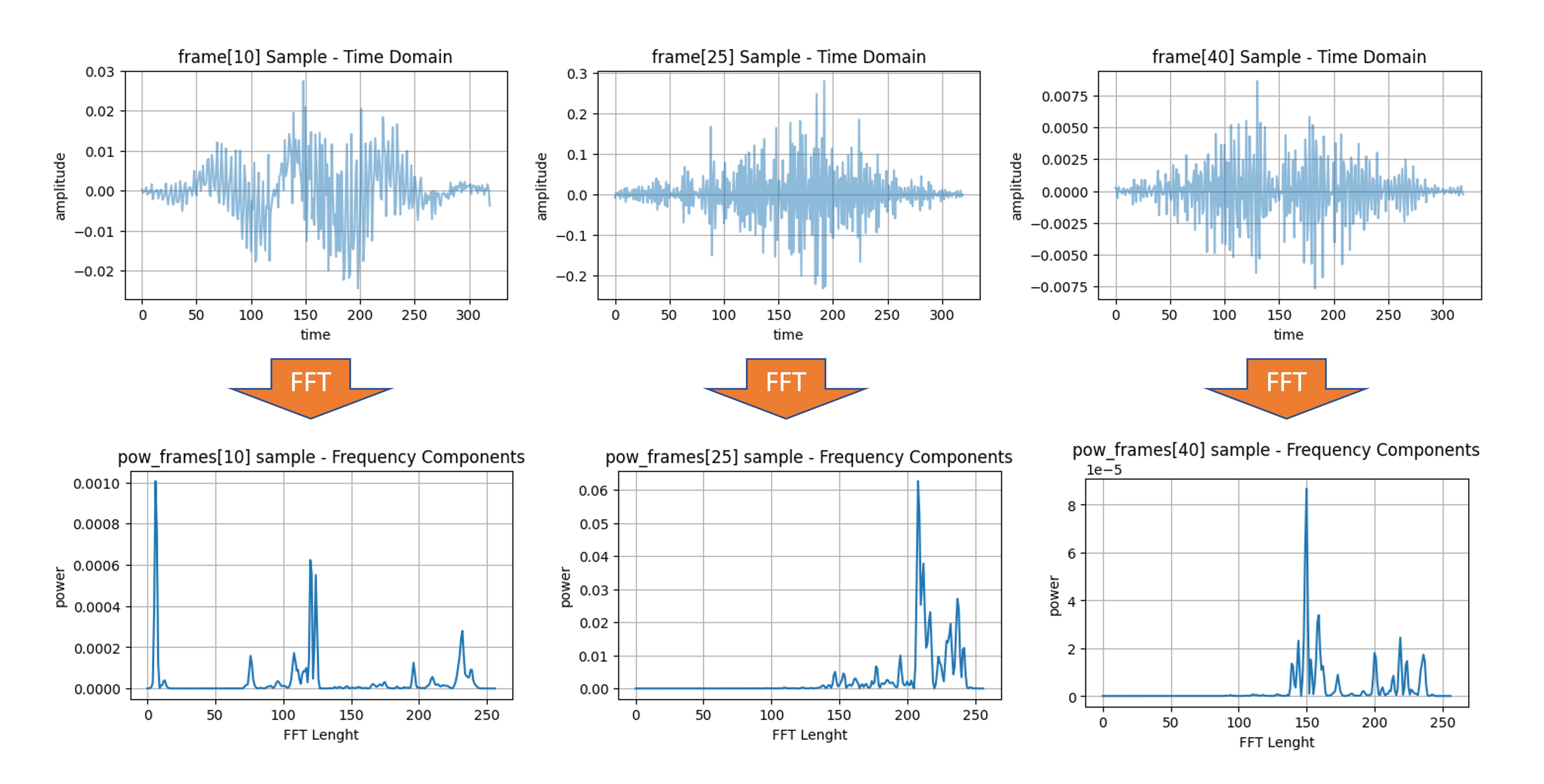 - Fast Fourier Transform (FFT) The Fast Fourier Transform (FFT) is applied to each windowed frame to convert it from the time domain to the frequency domain. The FFT gives us a complex-valued representation that includes both magnitude and phase information. However, for MFCCs, only the magnitude is used to calculate the Power Spectrum. The power spectrum is the square of the magnitude spectrum and measures the energy present at each frequency component.