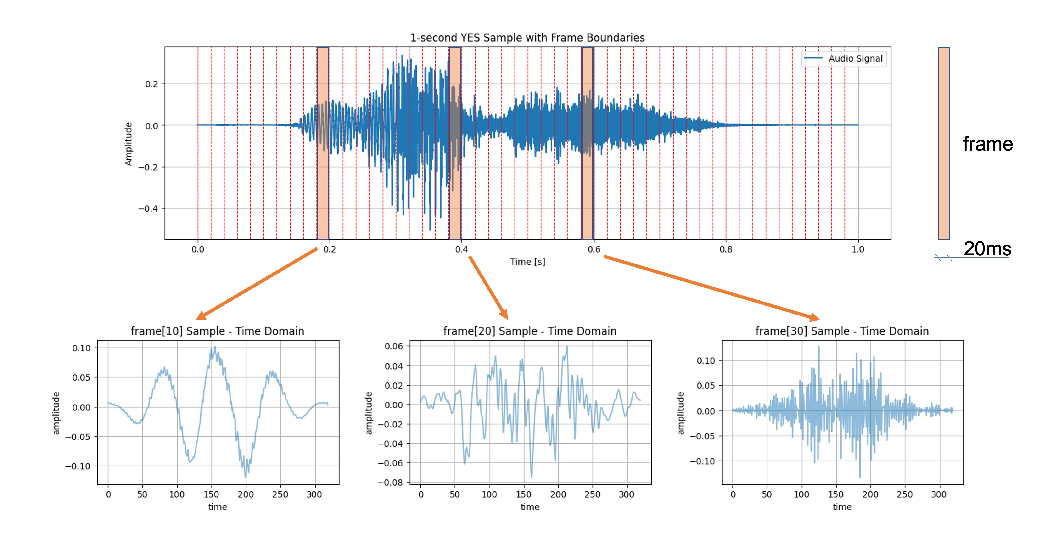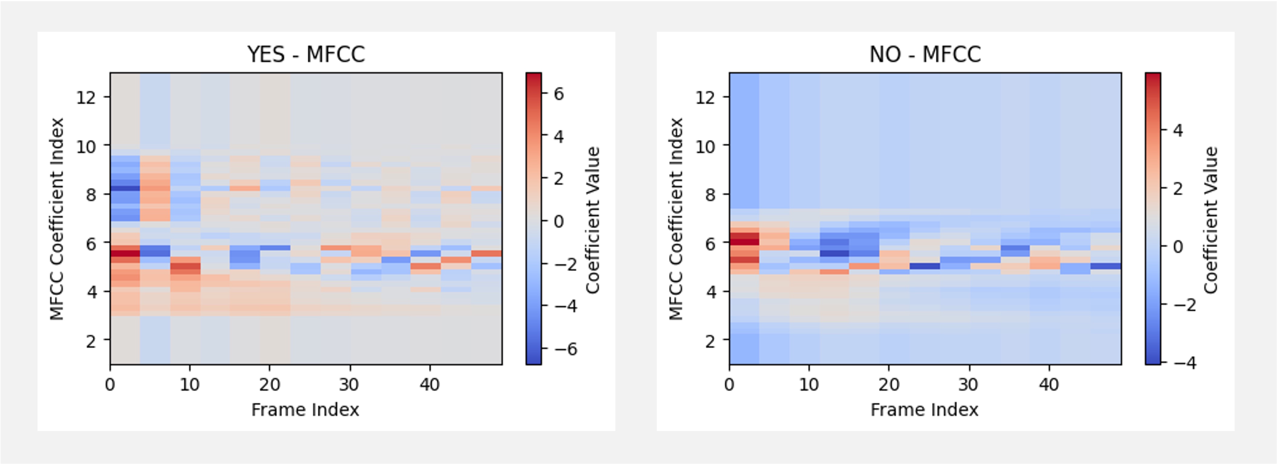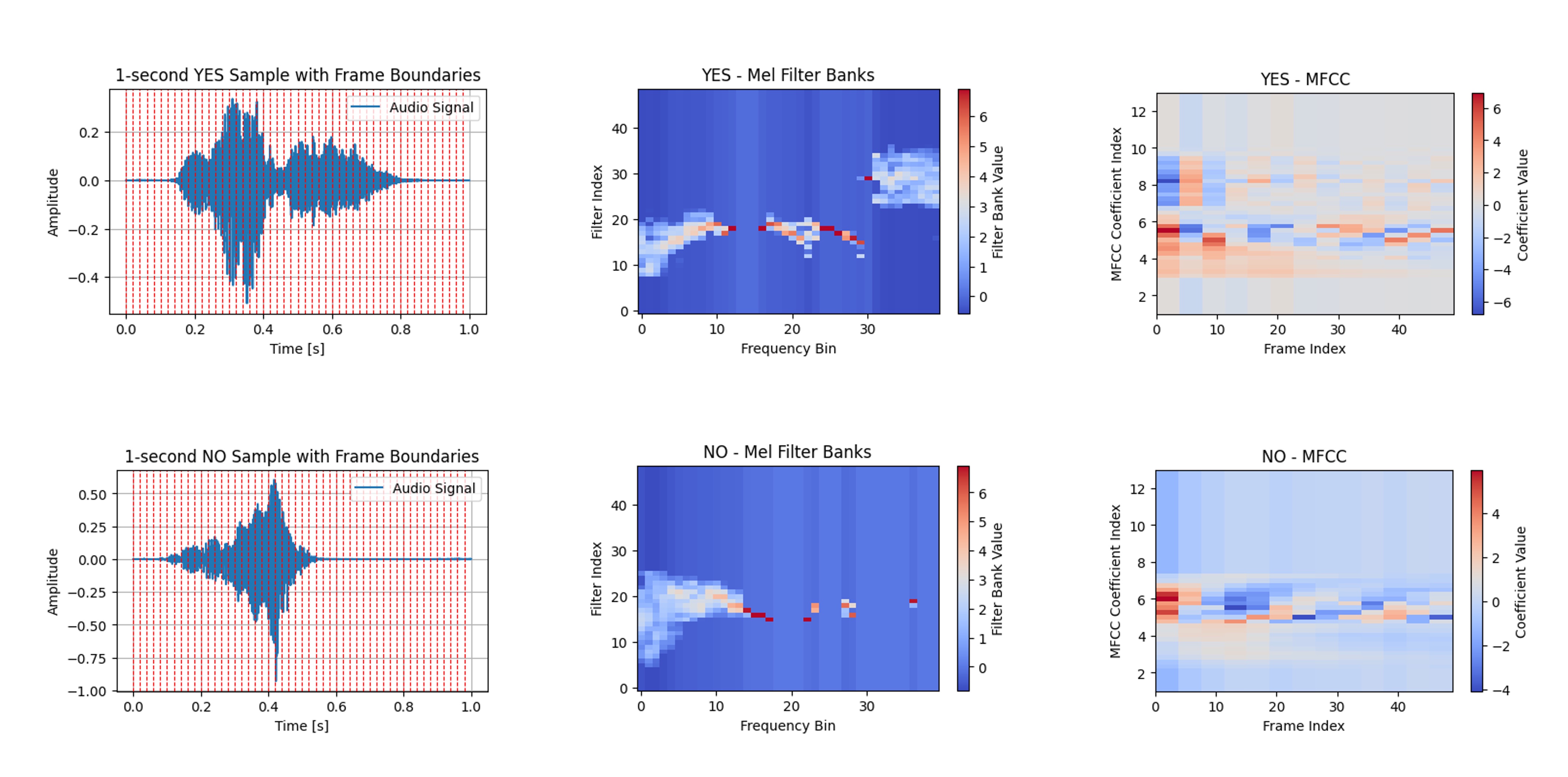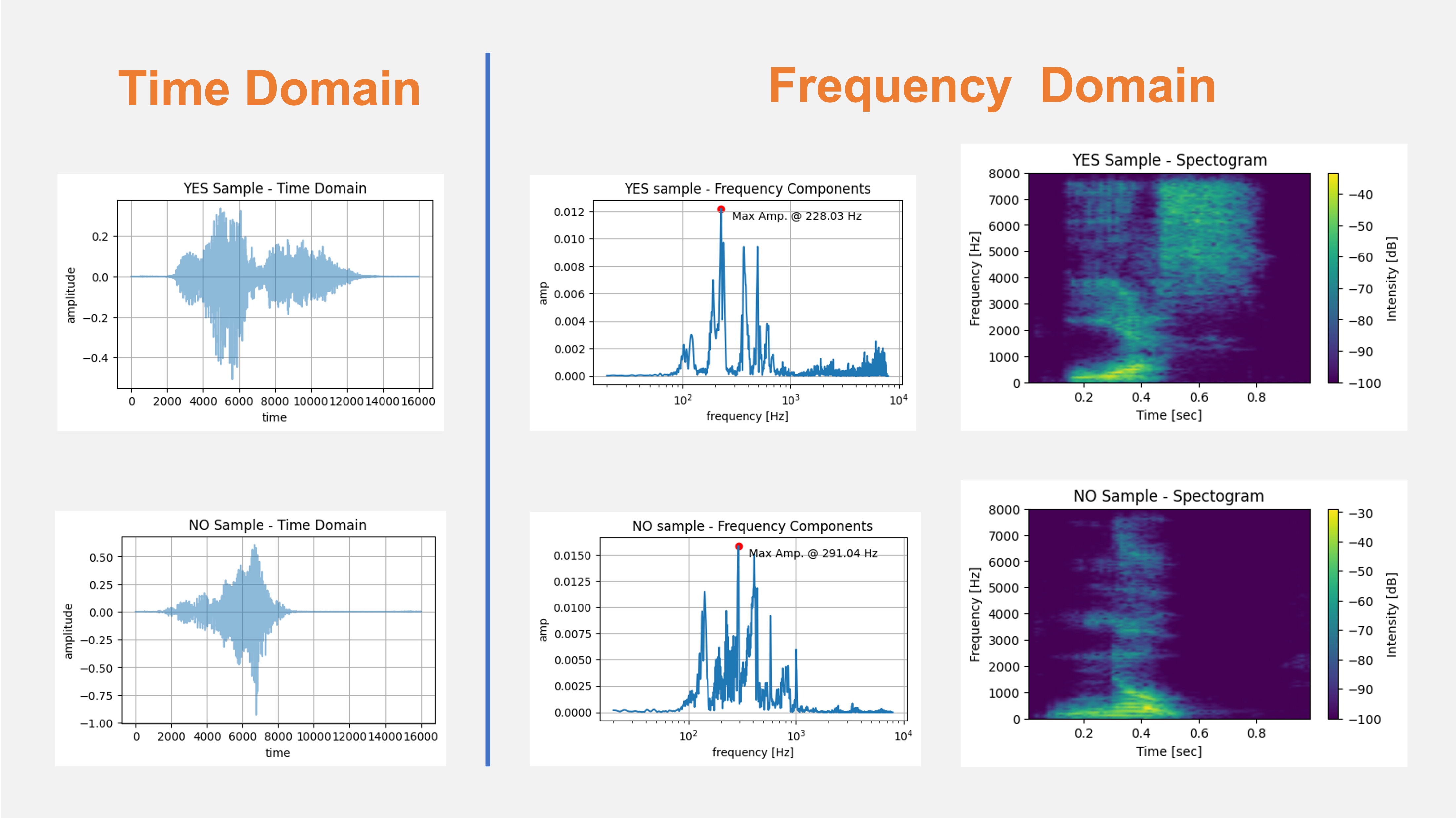 The image below shows the words YES and NO with typical representations in the Time (Raw Audio) and Frequency domains:
