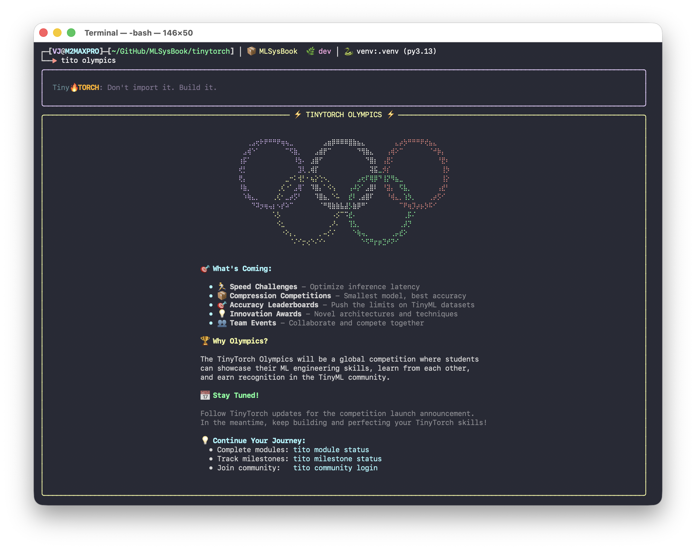 The Torch Olympics is TinyTorchâs capstone experienceâa comprehensive challenge where you integrate everything youâve learned across 19 modules to build, optimize, and compete with a complete ML system.